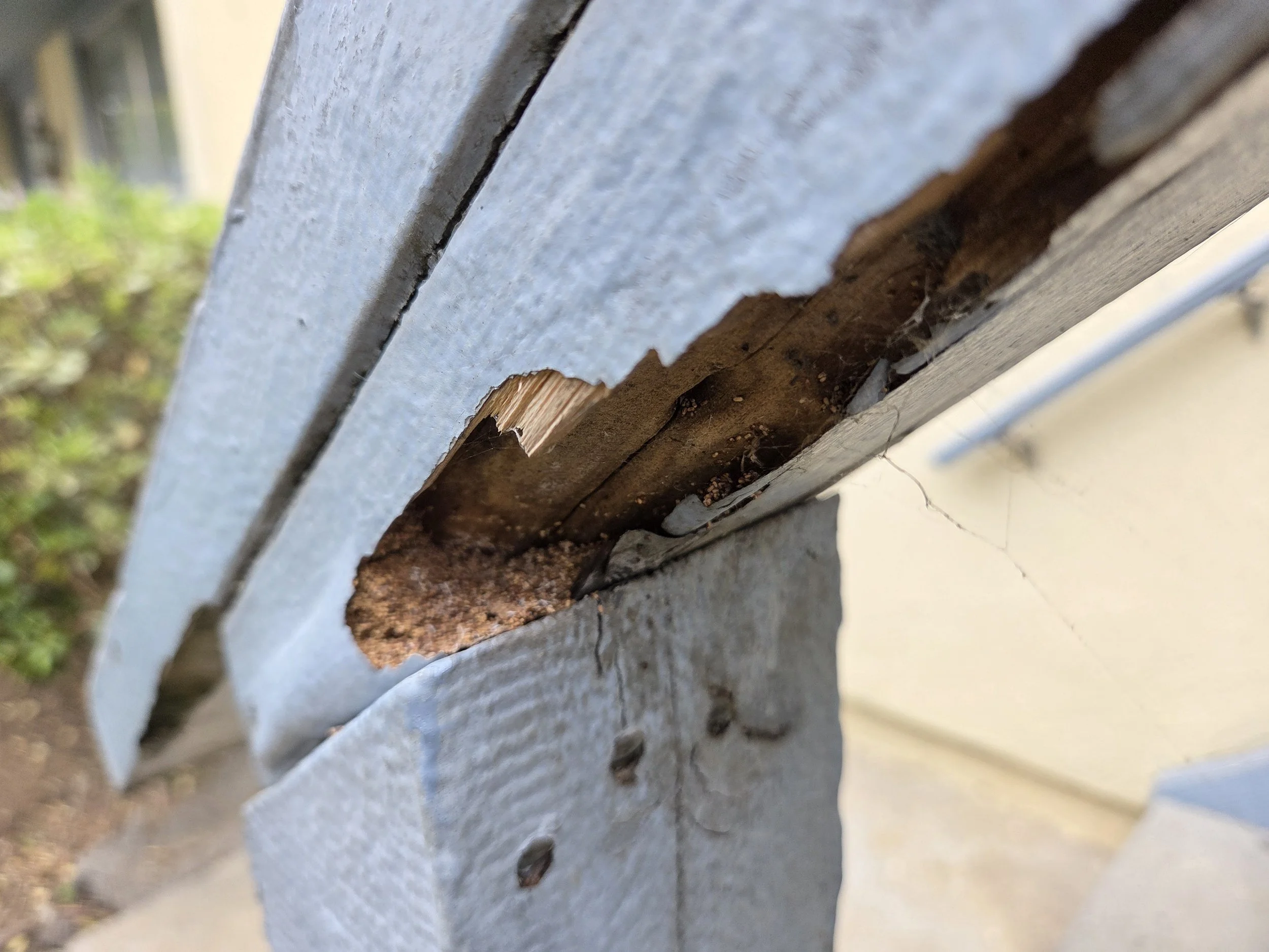 Railing showing termite damage and droppings